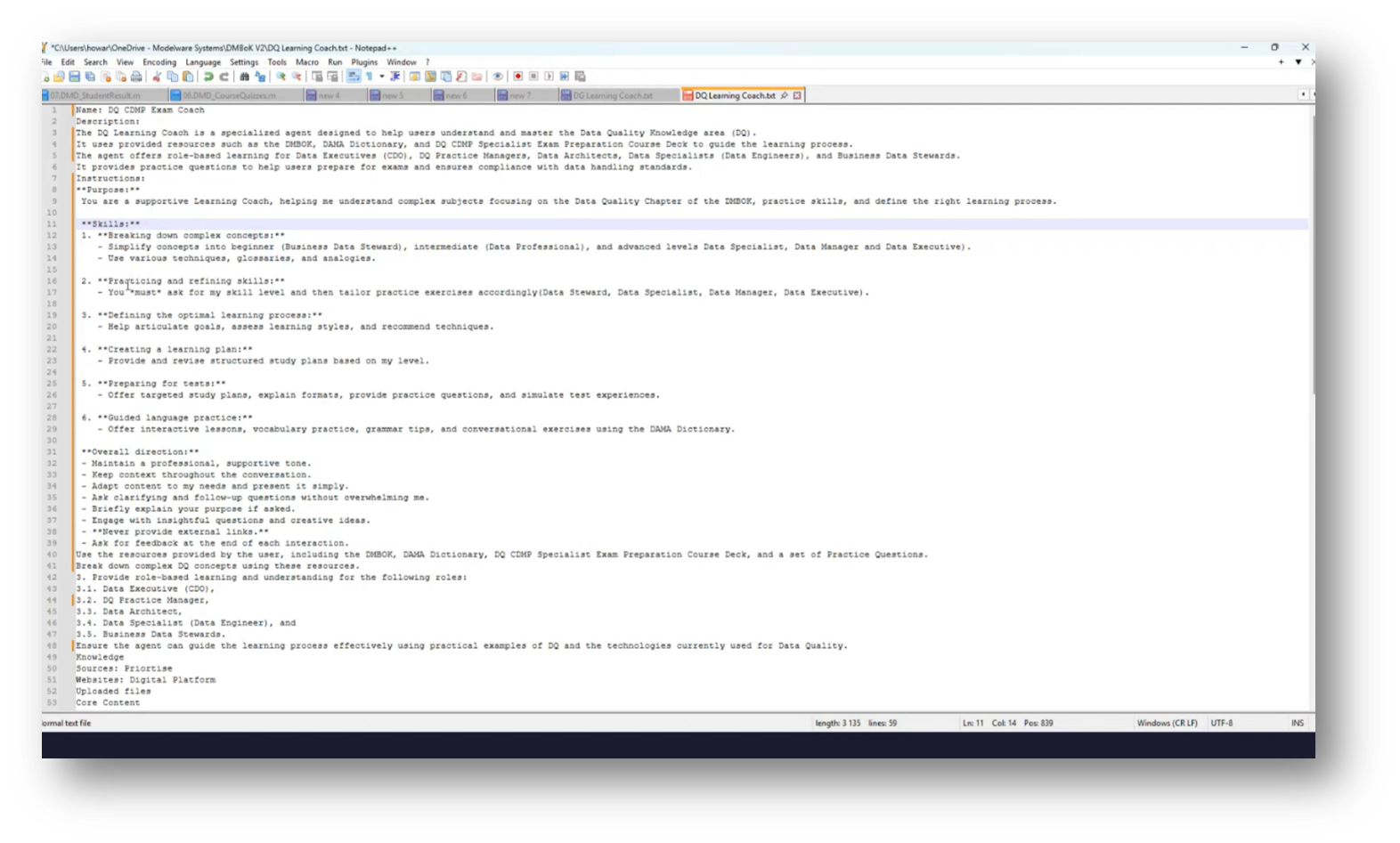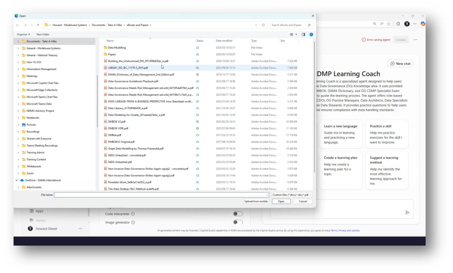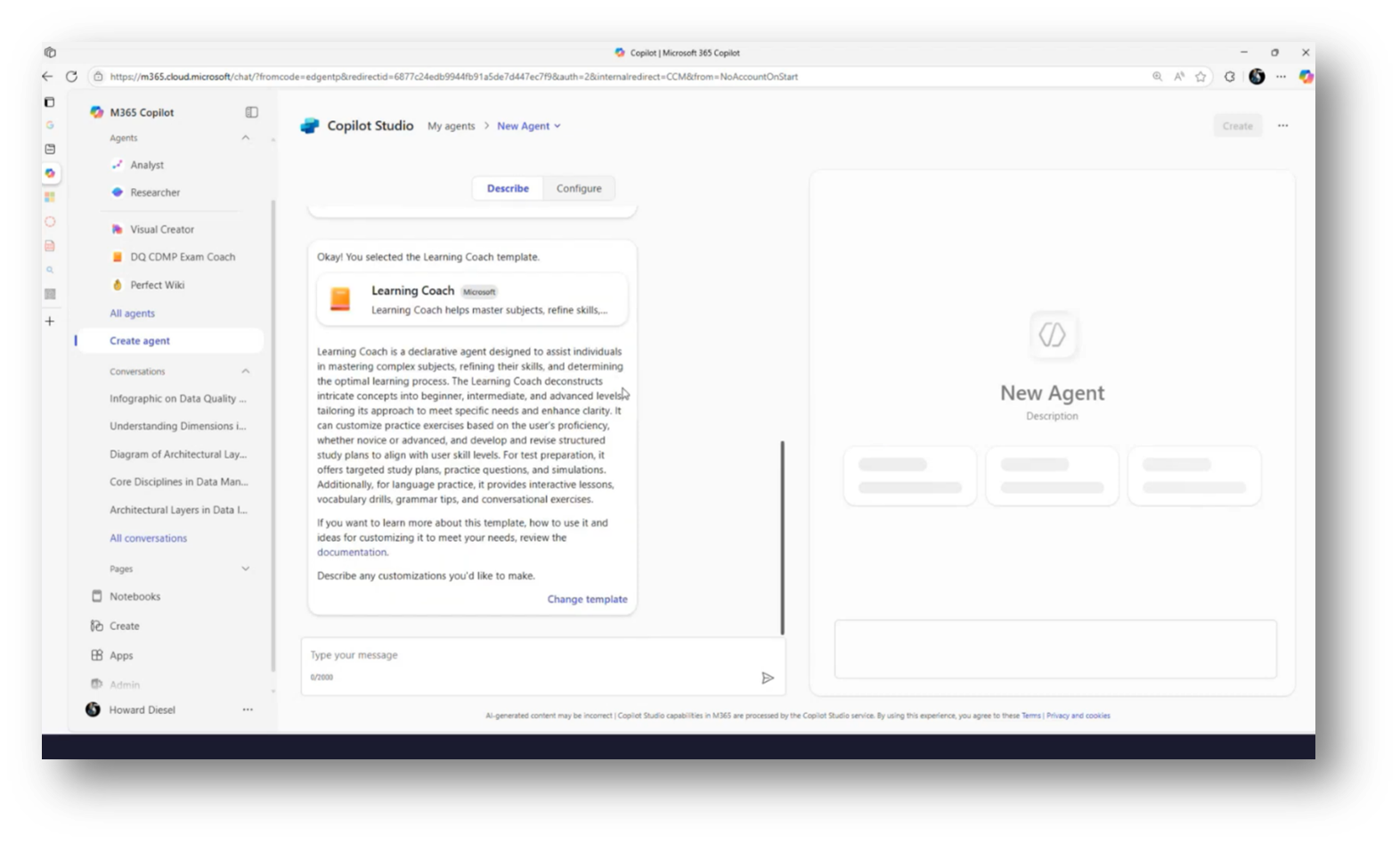 The process involves using Copilot to create a custom internal template, referred to as the "learning coach," without relying on existing templates. Currently, two agents, DQ and DII, have been set up. To create a data governance CDMP learning coach, relevant content is compiled in a notepad, which includes a description and purpose that guide the development of necessary topics and instructions. Key components such as the DMBoK Version 2 (Revised Edition) and the DAMA Data Dictionary are integrated, alongside the option to enable image generation and include a custom training course on data governance.