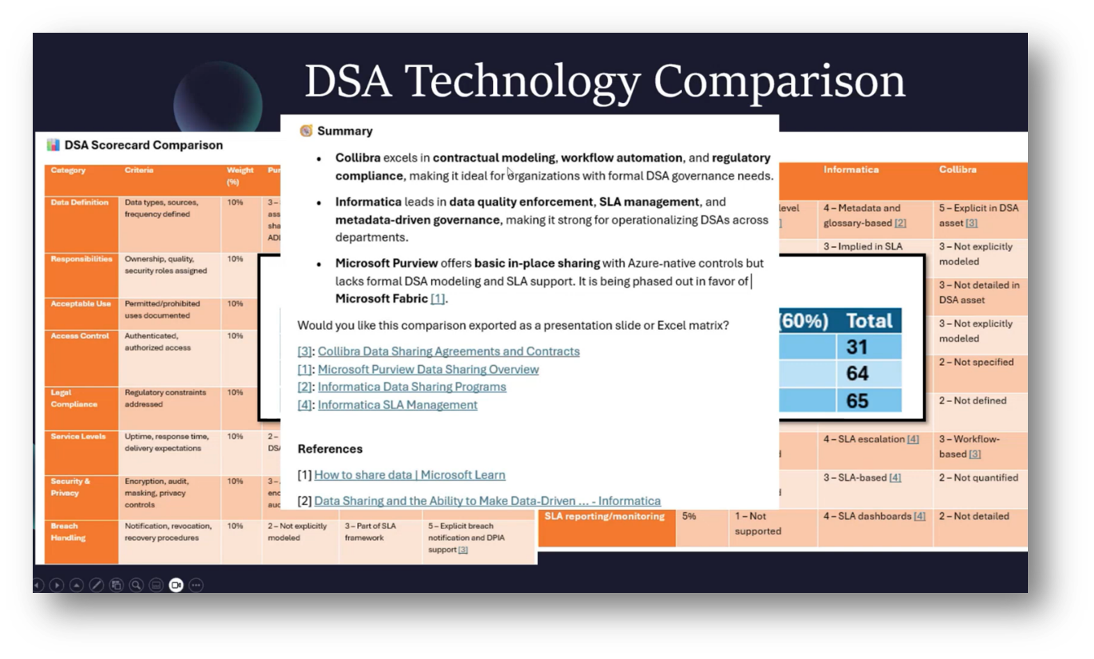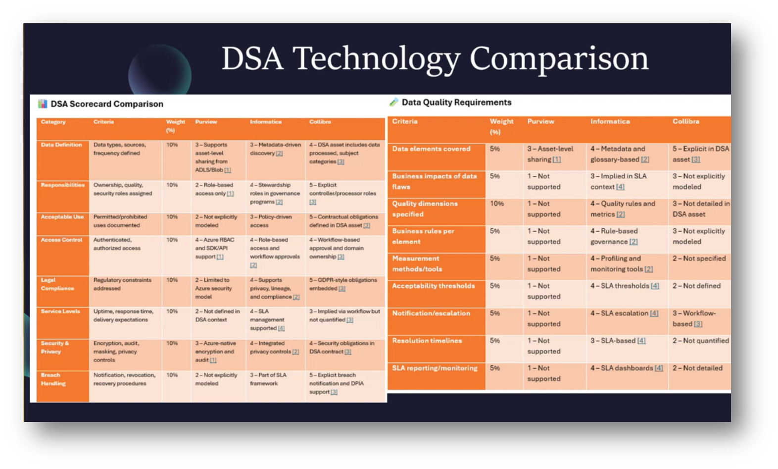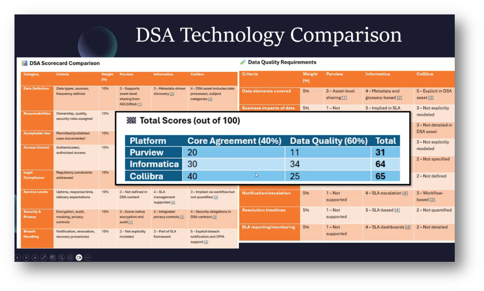 In a recent assessment, Calibra scored 40 in one category and 25 in another. At the same time, Microsoft Purview received lower scores of 20 and 11, and Informatica achieved the highest rating in the data quality section. By analysing my sample sharing agreements with the appropriate references, I was able to obtain scores for these agreements, enabling streamlined automation in their management.