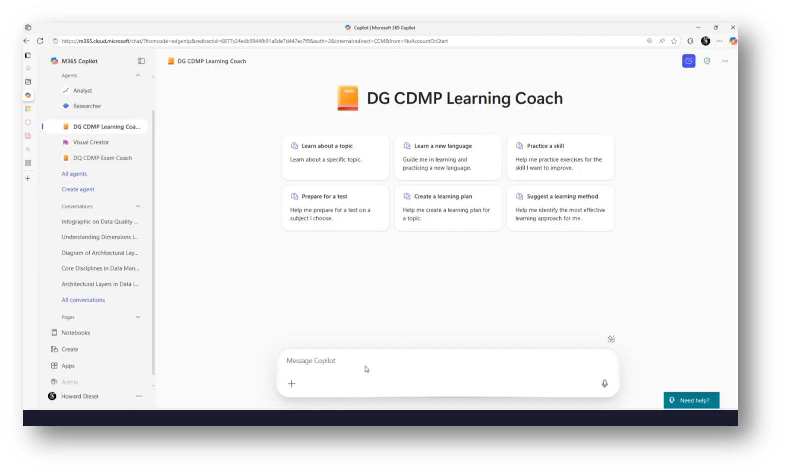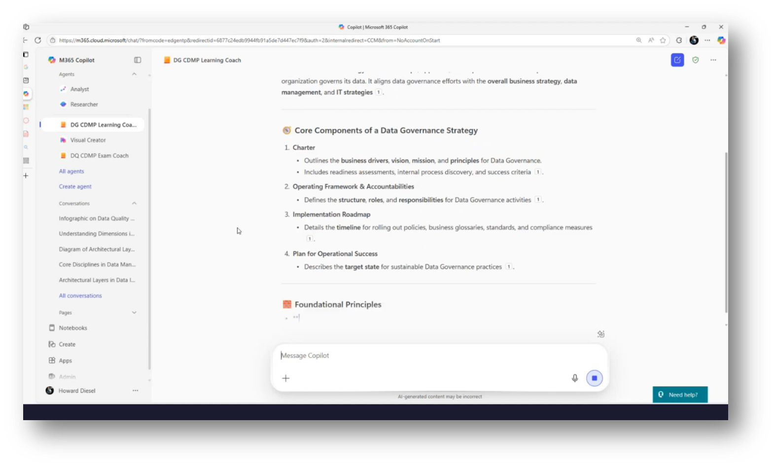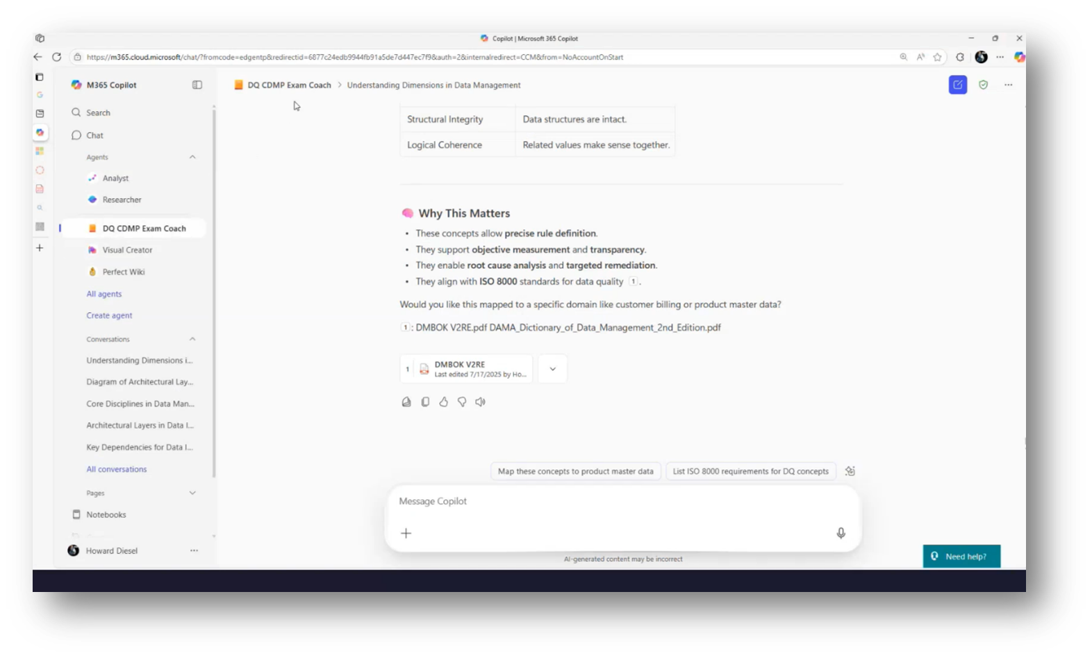 Howard showcased building an Agent with CoPilot, a Data Quality CDMP (Certified Data Management Professional) exam coach, using CoPilot. The Agent facilitates role-specific inquiries, such as exploring the dimensions and concepts of metrics necessary for setting up and implementing. The system allows users to interact from various roles and receive tailored information based on their queries.