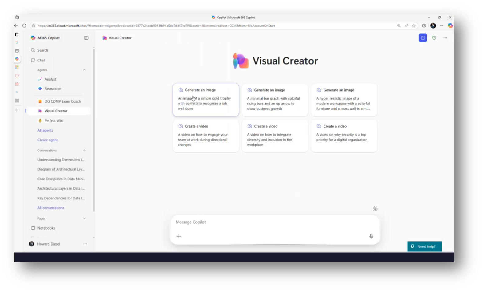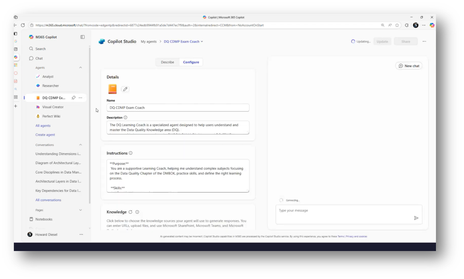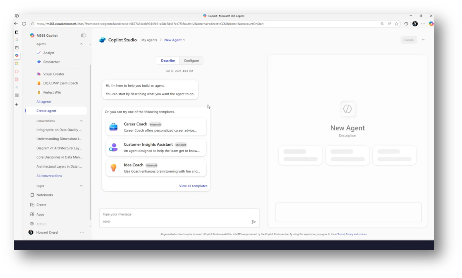 Howard showcased building an Agent with CoPilot, a Data Quality CDMP (Certified Data Management Professional) exam coach, using CoPilot. The Agent facilitates role-specific inquiries, such as exploring the dimensions and concepts of metrics necessary for setting up and implementing. The system allows users to interact from various roles and receive tailored information based on their queries.