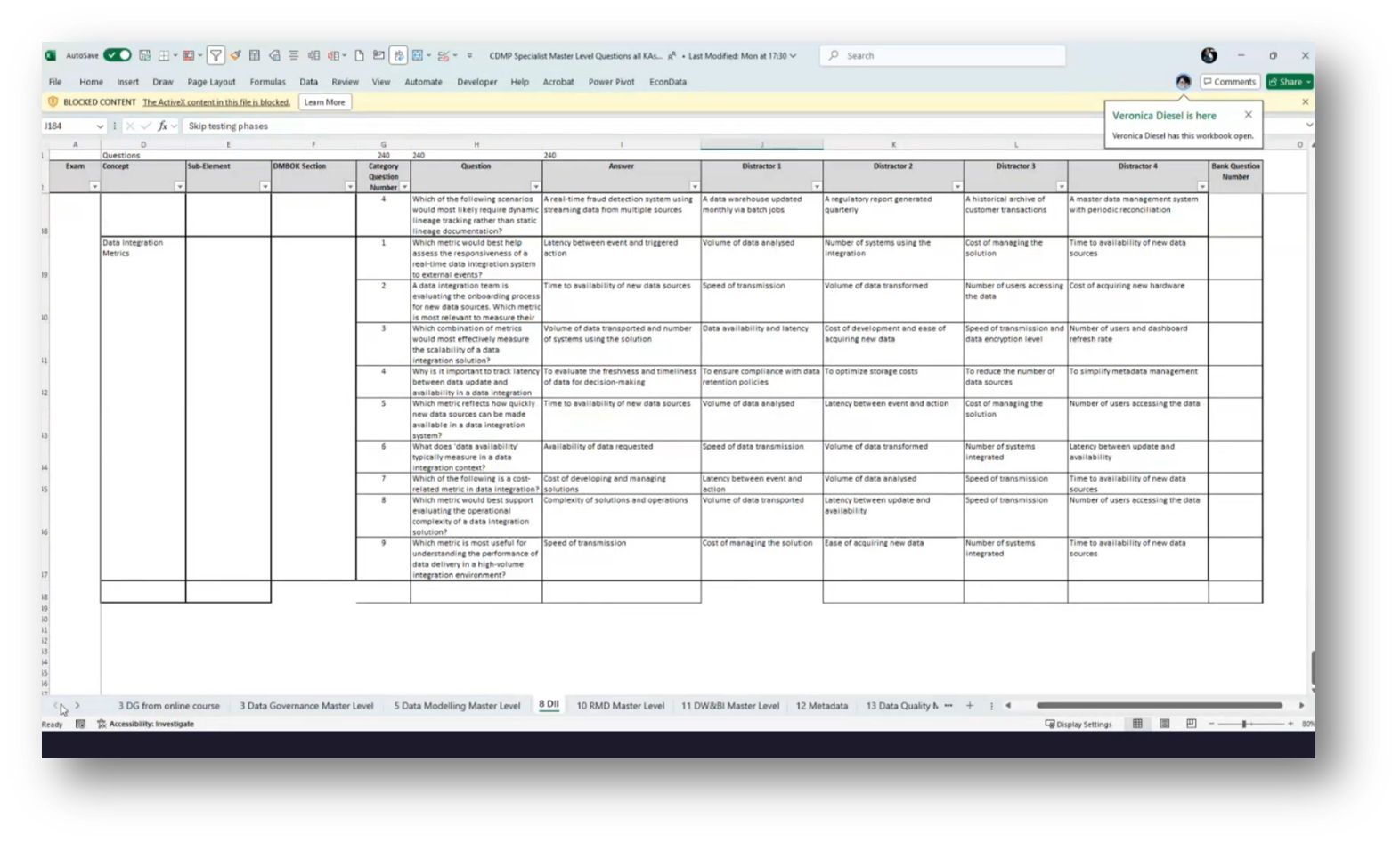 Howard outlined the various courses available for maturity assessment training, emphasising the option to choose between all courses or specific ones. A current challenge mentioned is the need to keep PDF files under 30 megabytes. Additionally, it highlights the ongoing collaboration with Veronica to develop master-level exam questions, which aid in preparing individuals for the exam by organising and managing relevant questions effectively.