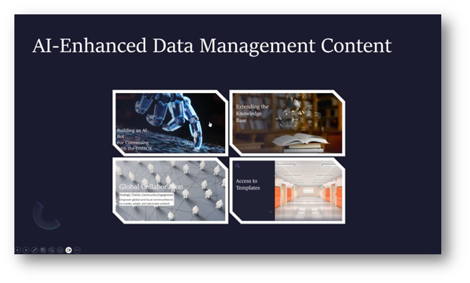 Howard then highlighted the need for global collaboration and a revised approach to the DM Box interface, emphasising the importance of managing content growth and keeping it dynamic without frequent updates. He noted that queries had been raised regarding the scope of DMBoK Version 3, specifically whether it pertains solely to DMBoK content or extends to developing a community platform. Currently, there are no defined parameters for the content or the digital platform; stakeholders have been directed to outline how interactions will occur and how content growth will be managed.
