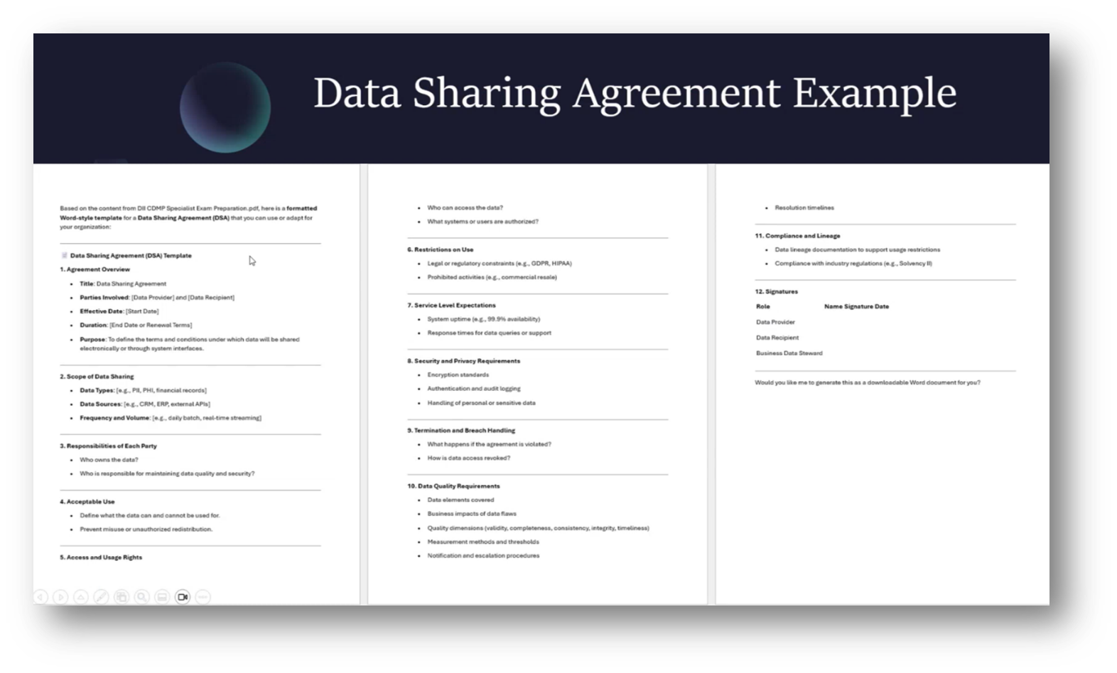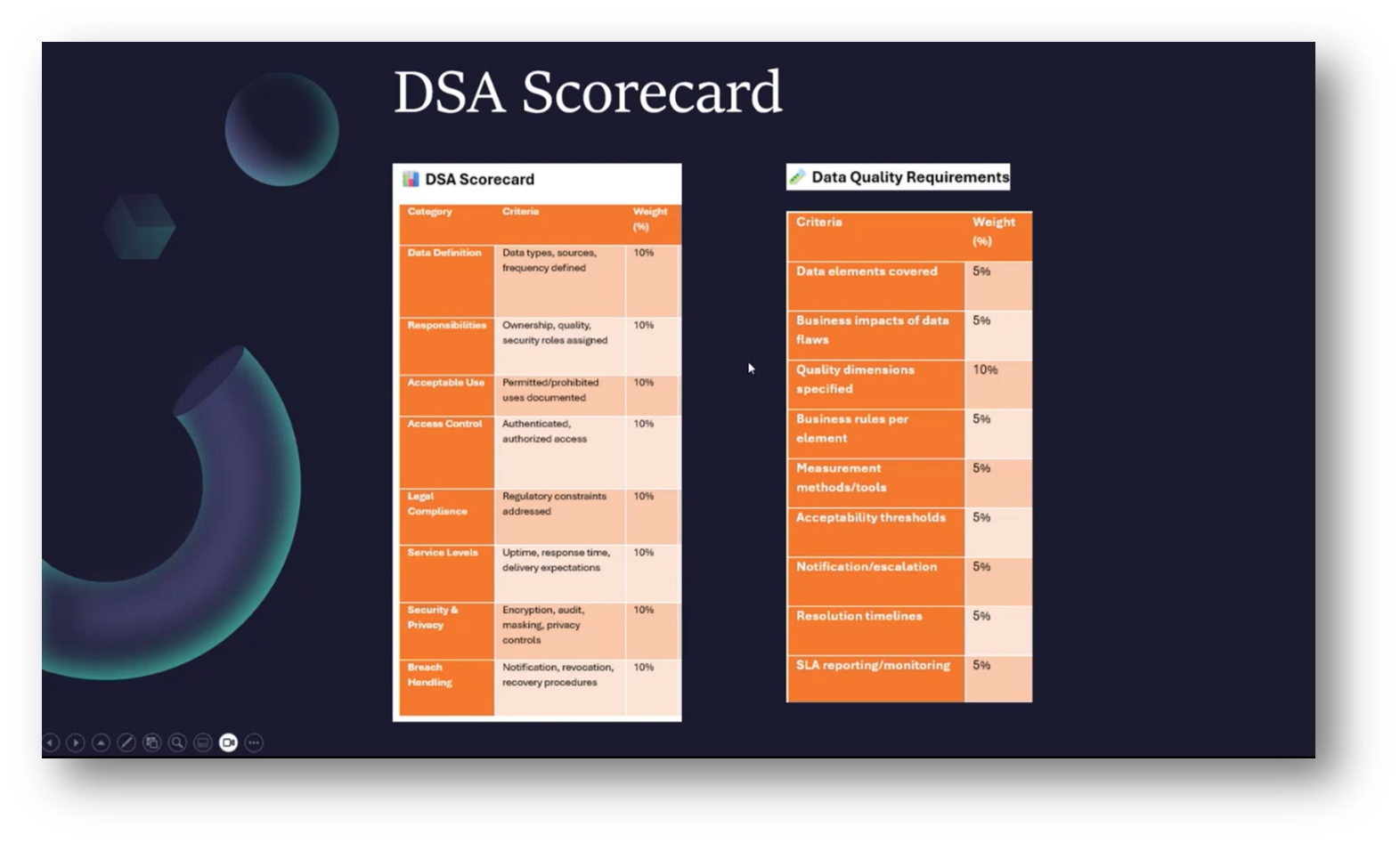 The creation of a data sharing agreement and the development of a scorecard to evaluate its components were touched on. Howard shared that this was developed based on insights from a previous data modelling scorecard and that the focus is on establishing categories that collectively account for 100%. A key observation is the frequent absence of data quality requirements in these agreements. To address this, a scorecard has been designed specifically for data sharing agreements within the organisation, incorporating these necessary data quality elements.