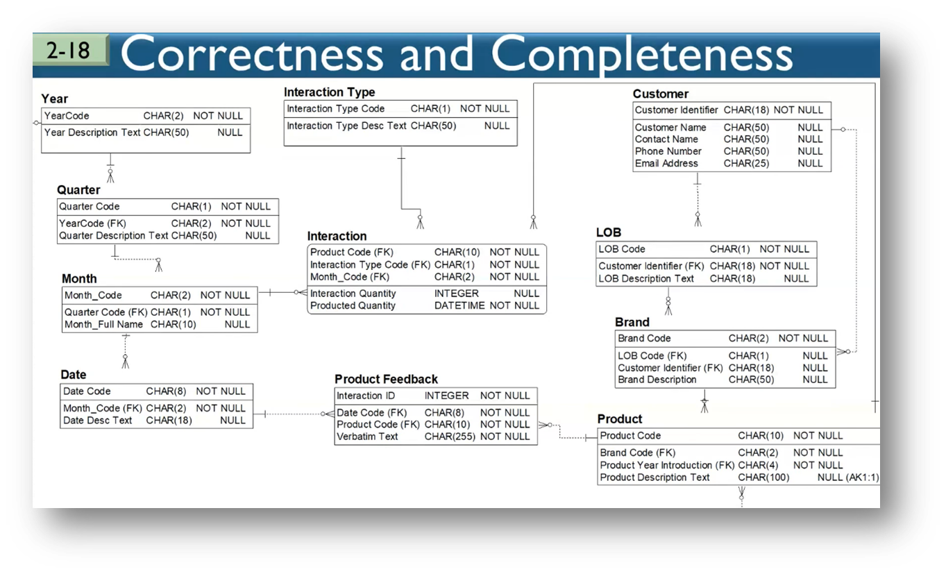 Checking the completeness at a schema level is necessary to ensure that all master and reference data is published to the enterprise data warehouse. Consistency in data encompasses logical, format, temporal, and distributed data equivalence, specifically focusing on business-driven format requirements and slowly changing dimensions for temporal consistency.