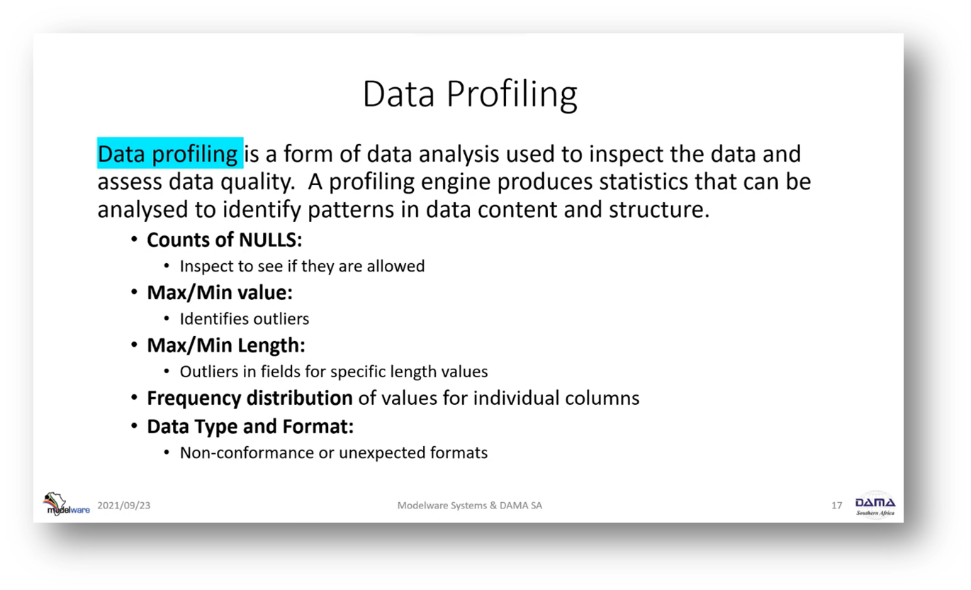 Data profiling is a continuous process that is done during the specification stage and throughout the run of data from the system. Regular profiling is essential as data can become dirty overnight. To ensure data quality for decision-making, set targets for exceptional reports, and continually validate business rules.