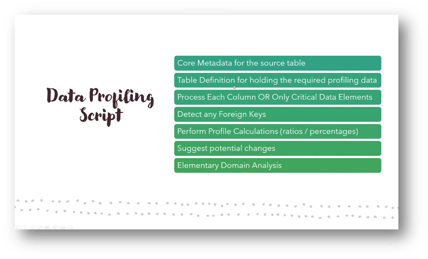 Data profiling is a valuable technique for analysing data at a column level and identifying unique business keys. Profiling scripts offer data length, data type, and other analysis ratios like minimum and maximum values, distinct values, and zero-length percentages. These scripts can process metadata from the source table and profile data daily.