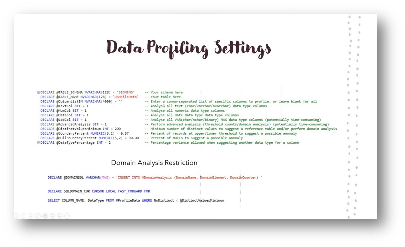 Critical data elements can be defined, and DQM reports can be generated. The script can detect foreign keys and suggest potential data changes while conducting elementary domain analysis. Advanced options include domain analysis for reference data, upper and lower threshold analysis, null percentages, and variance warnings.
