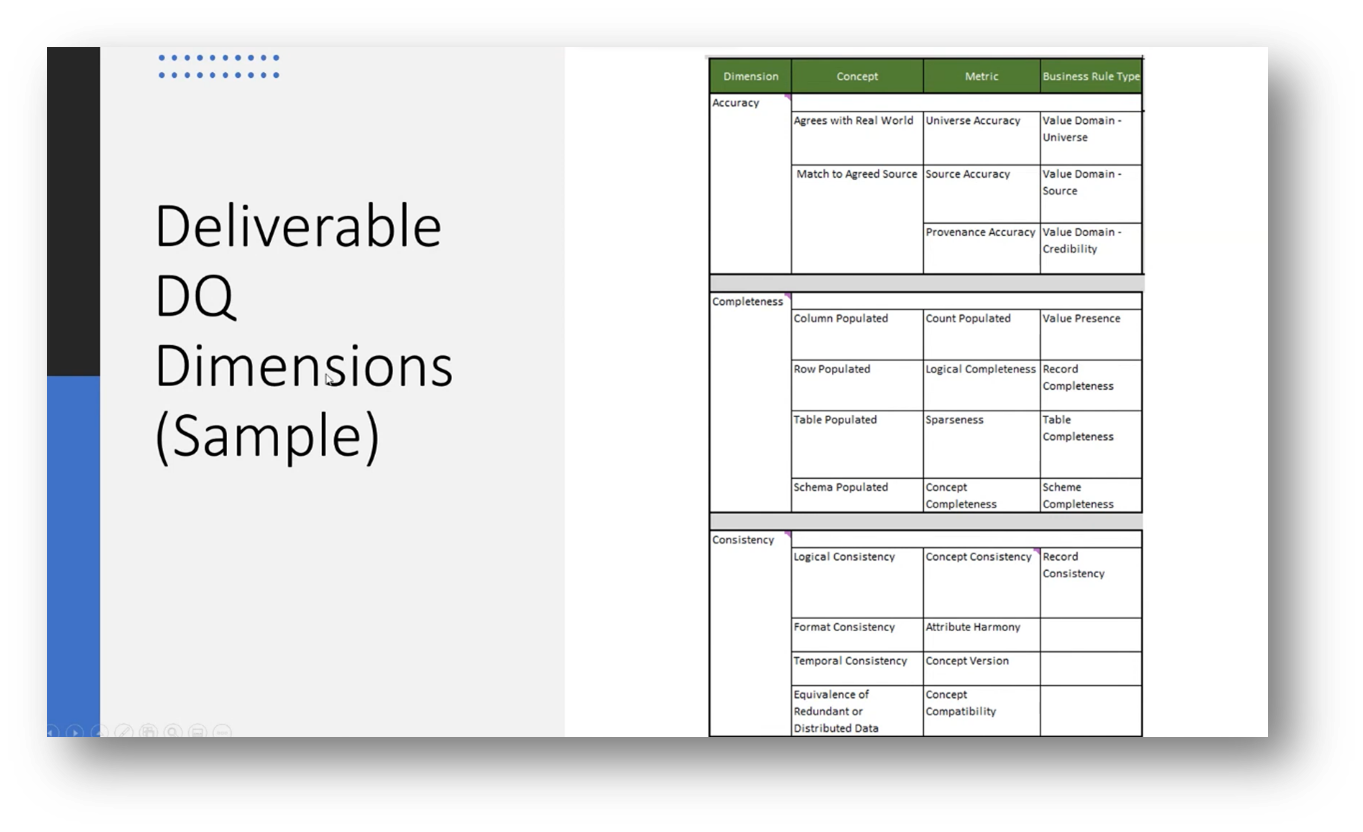 Accuracy of reference and master data is evaluated based on requirements, data model accuracy, and link to industry taxonomies. Each concept, such as accuracies and completeness, is mapped to reference data and compared for value domain and presence in the system of records and the completeness of the golden record.