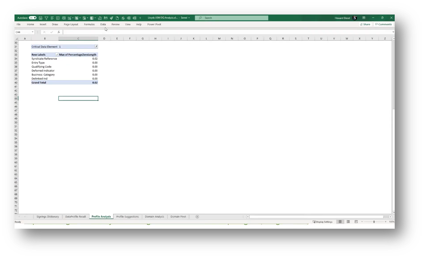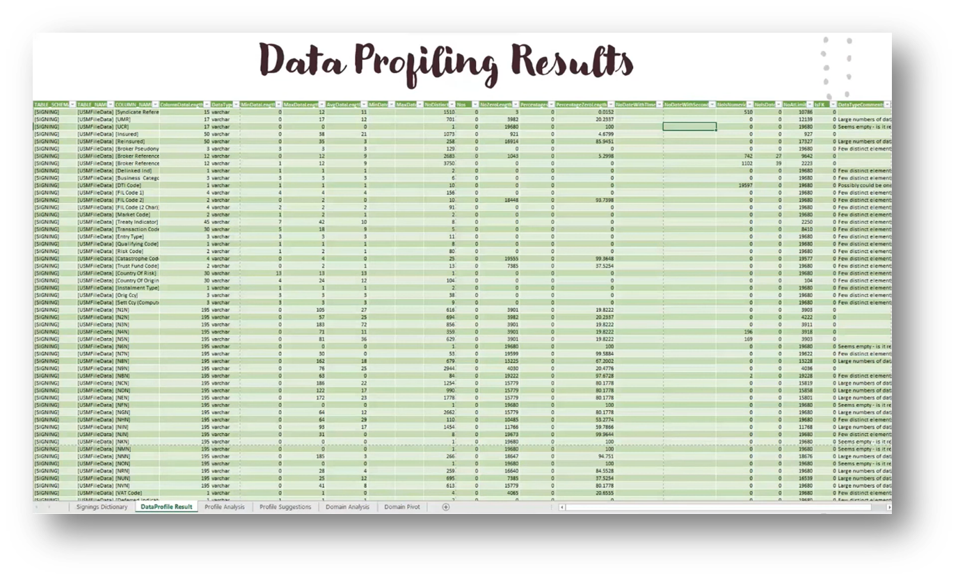 The script performs advanced analytics on critical data elements, columns, and data types, analysing large objects varchar max to look for distinct values and records on the boundaries. The domain analysis is performed only on columns with less than 200 distinct values, providing a distribution of those values for data quality assessment. The data profiling data model utilises a dictionary to provide information on the order of fields, names, descriptions, data types, validation rules, and other important details. Additionally, the data set profiling results include information on market reference, syndicate reference, broker pseudonyms, business categories, and the length of specified fields compared to actual lengths found in the data. Discrepancies between specified and actual data definitions must be addressed.