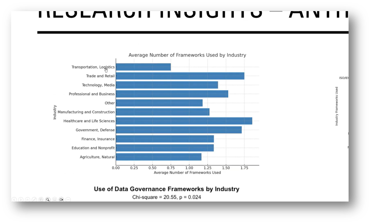 The surprising findings from research conducted by Anthony Mazzarella regarding the use of frameworks across different industries, particularly noting that the finance and insurance sectors average only 1.25 frameworks, which is unexpectedly low compared to healthcare and life sciences.