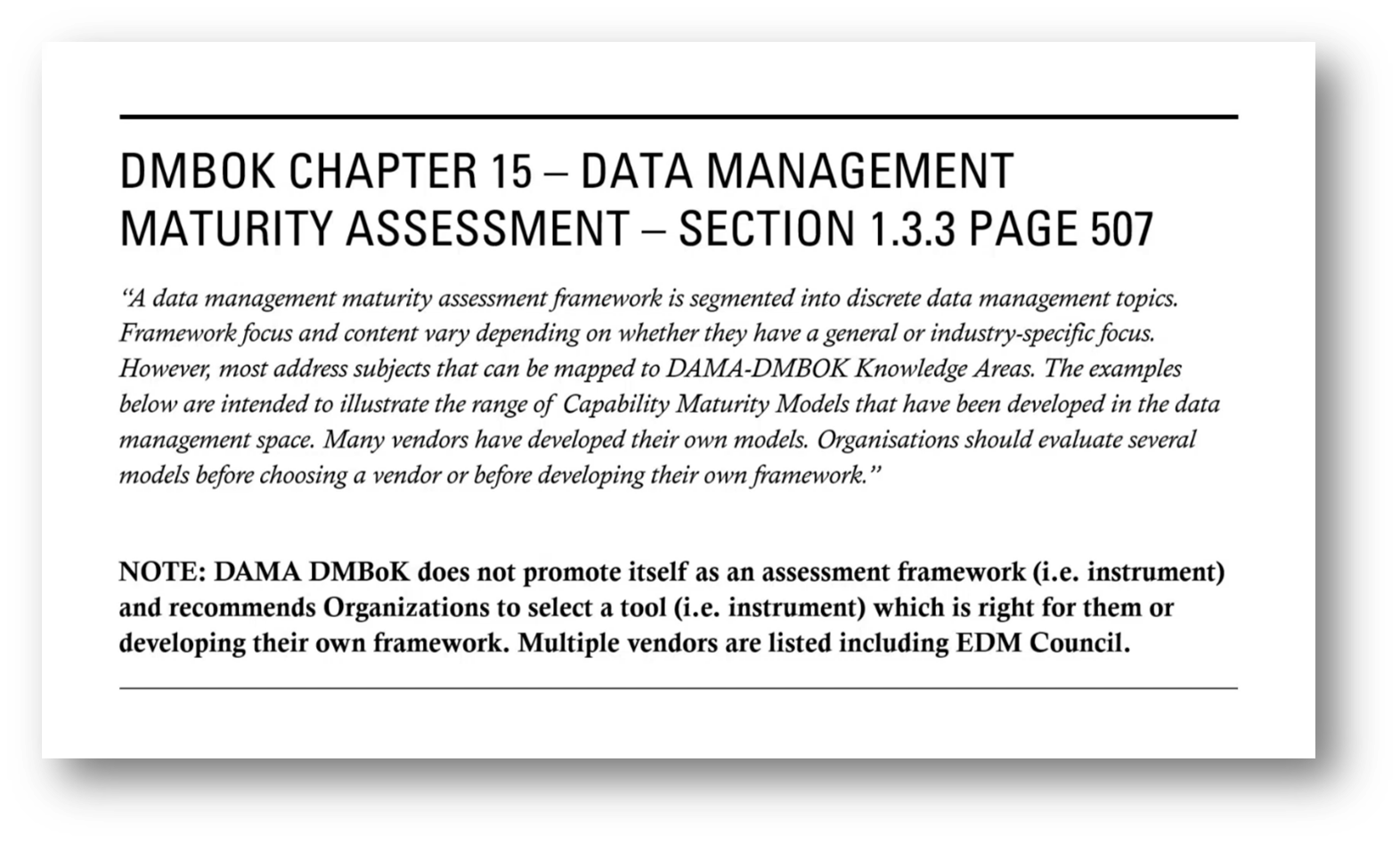 The DMBoK allows organisations to create bespoke assessments but does not benchmark against others, which can lead to confusion. It is particularly useful for organisations at lower maturity levels, while advanced practitioners may require more structured tools like DCAM to develop effective data management practices within their specific industries.