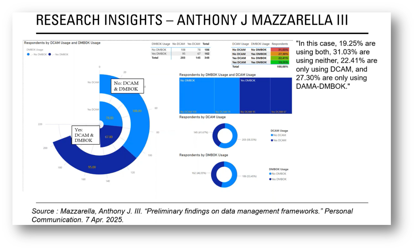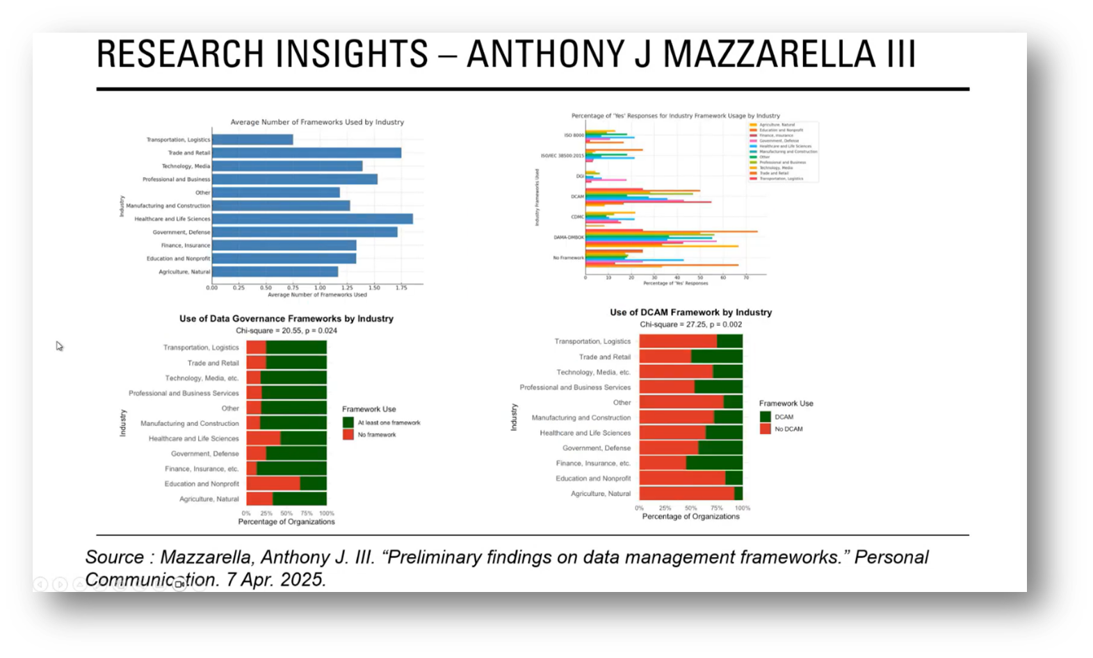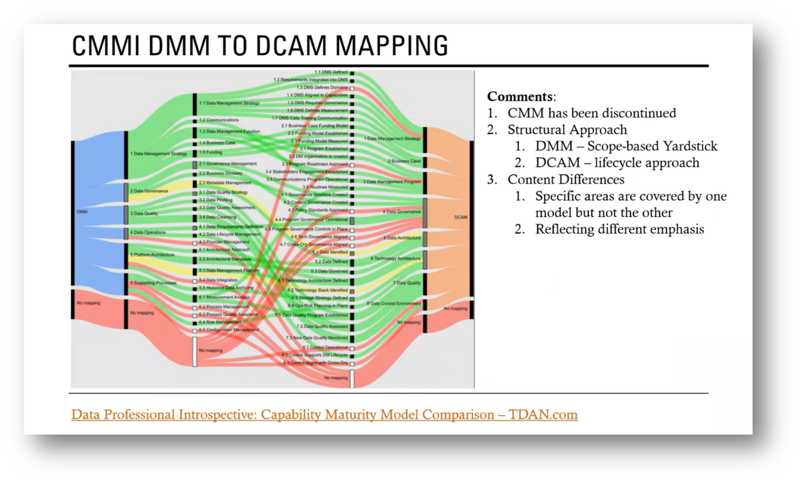 Melanie Mecca's work highlighted the misalignment between the Data Management Maturity (DMM) and the Capability Maturity Model Integration (CMMI) frameworks, emphasising their different structural approaches: DMM serves as a scope-based yardstick, while DCAM takes a lifecycle perspective to assess practices at various stages.