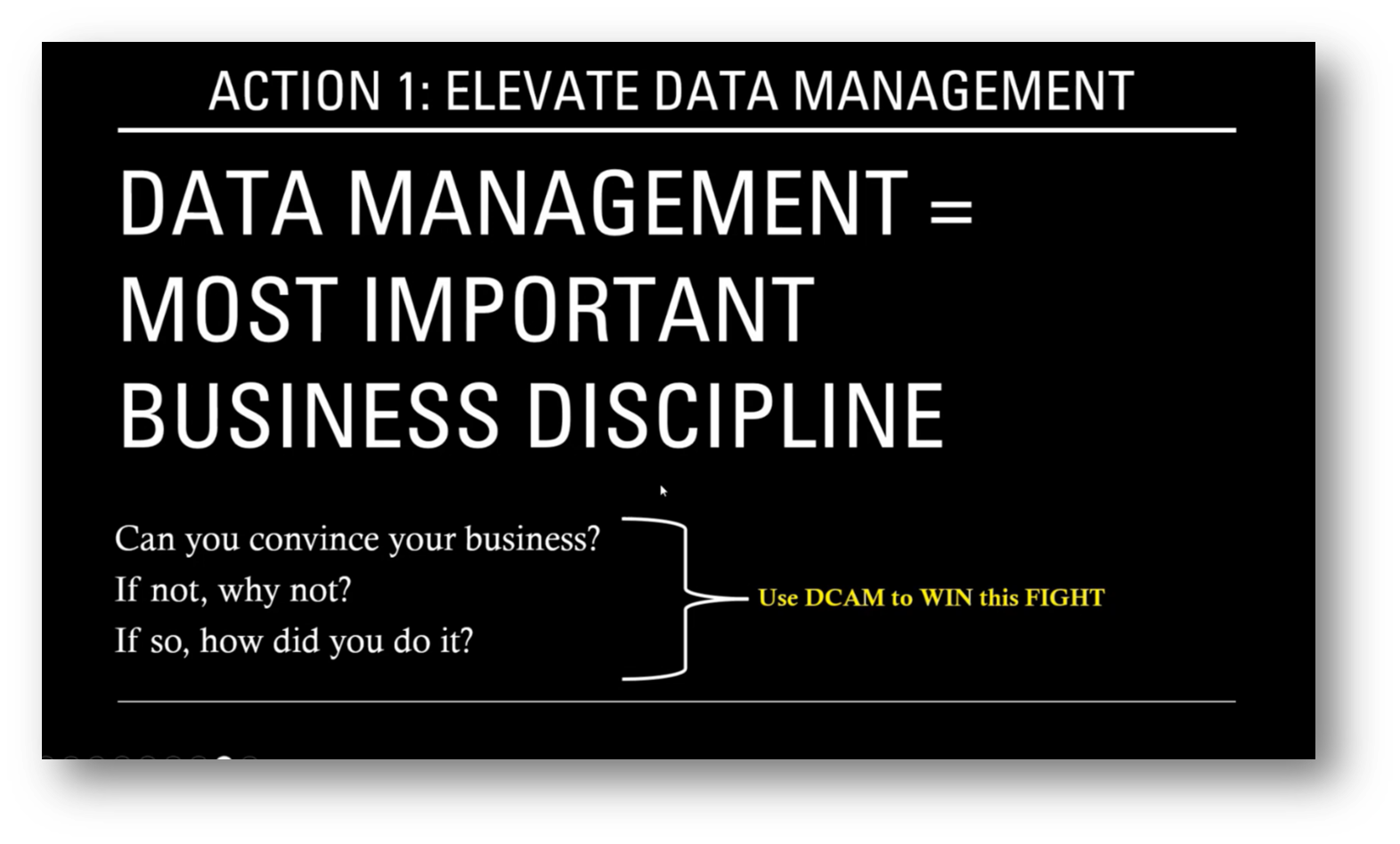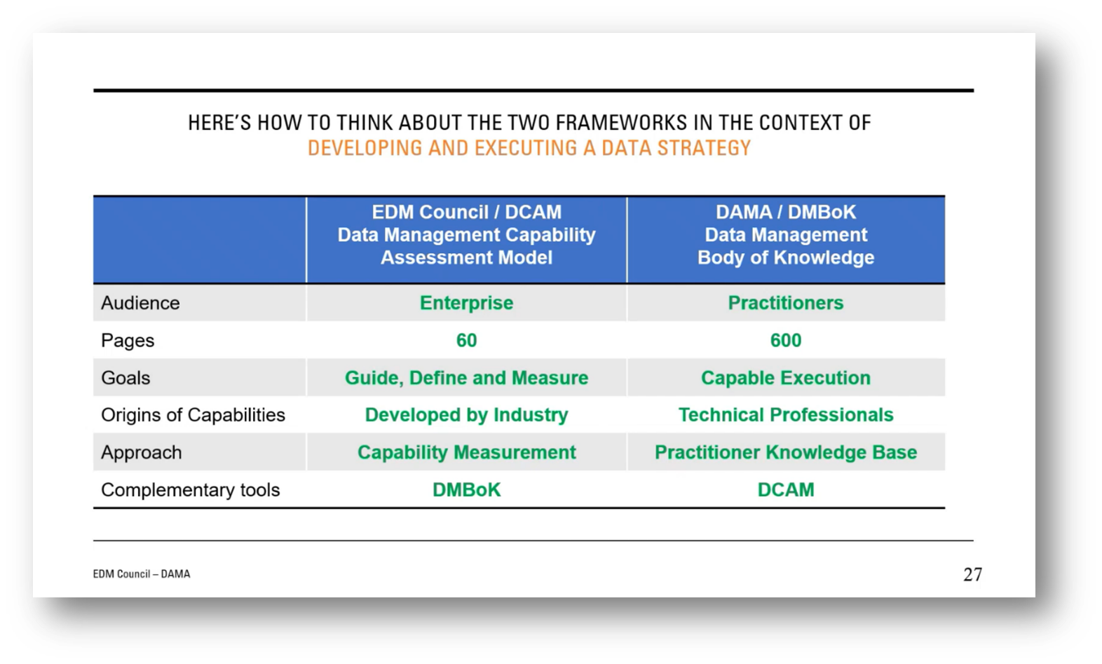 To elevate data management as a critical business discipline, it is essential to leverage frameworks such as DCAM and DMBOK. While DCAM represents the high ground in data management capabilities, DMBOK serves as a foundational resource that aligns with the necessary practices within organisations.