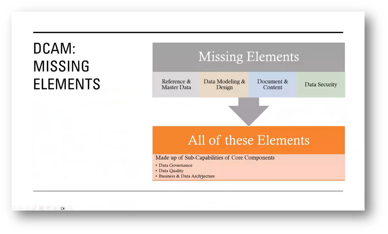 The absence of reference and master data within the DCAM framework raises concerns. While the framework doesn't explicitly label elements as reference and master data, it encompasses essential components like data quality, integration, policies, and procedures necessary for effective management. Additionally, the DCAM lifecycle adequately addresses data modelling, documentation, and security without needing a separate designation.