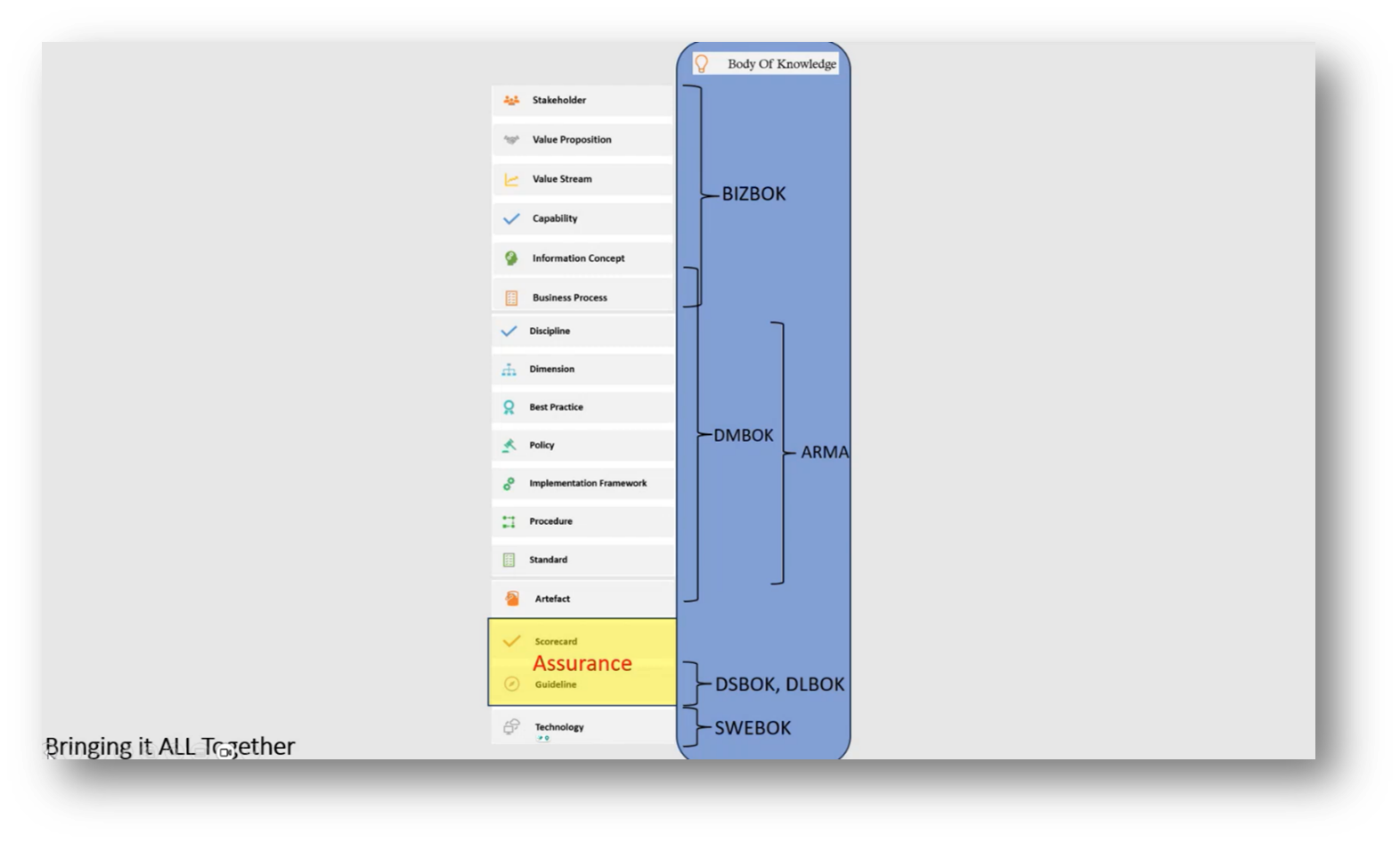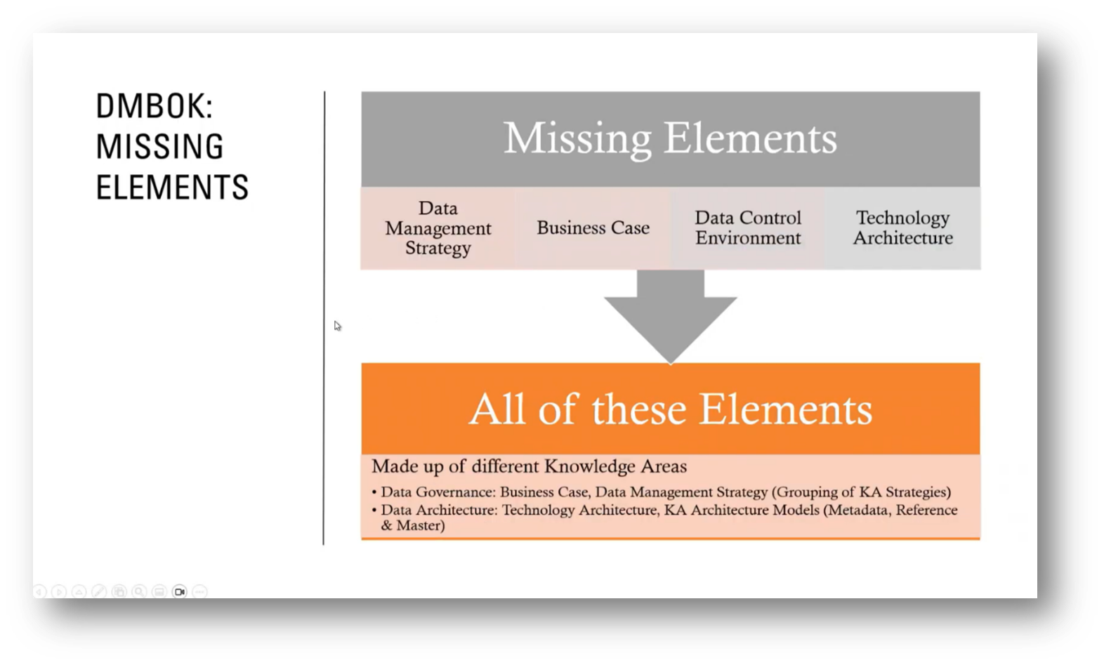 Howard and Attendees also addressed the lack of guidance in the DMBoK, particularly regarding coordinating efforts across different areas. Howard suggests that methods like the "crawl, walk, run" framework could be beneficial. Additionally, the importance of developing meaningful KPIs within this vast landscape is underscored, alongside a proposal for collaboration to explore the integration of these concepts in the upcoming version of DM BoK.