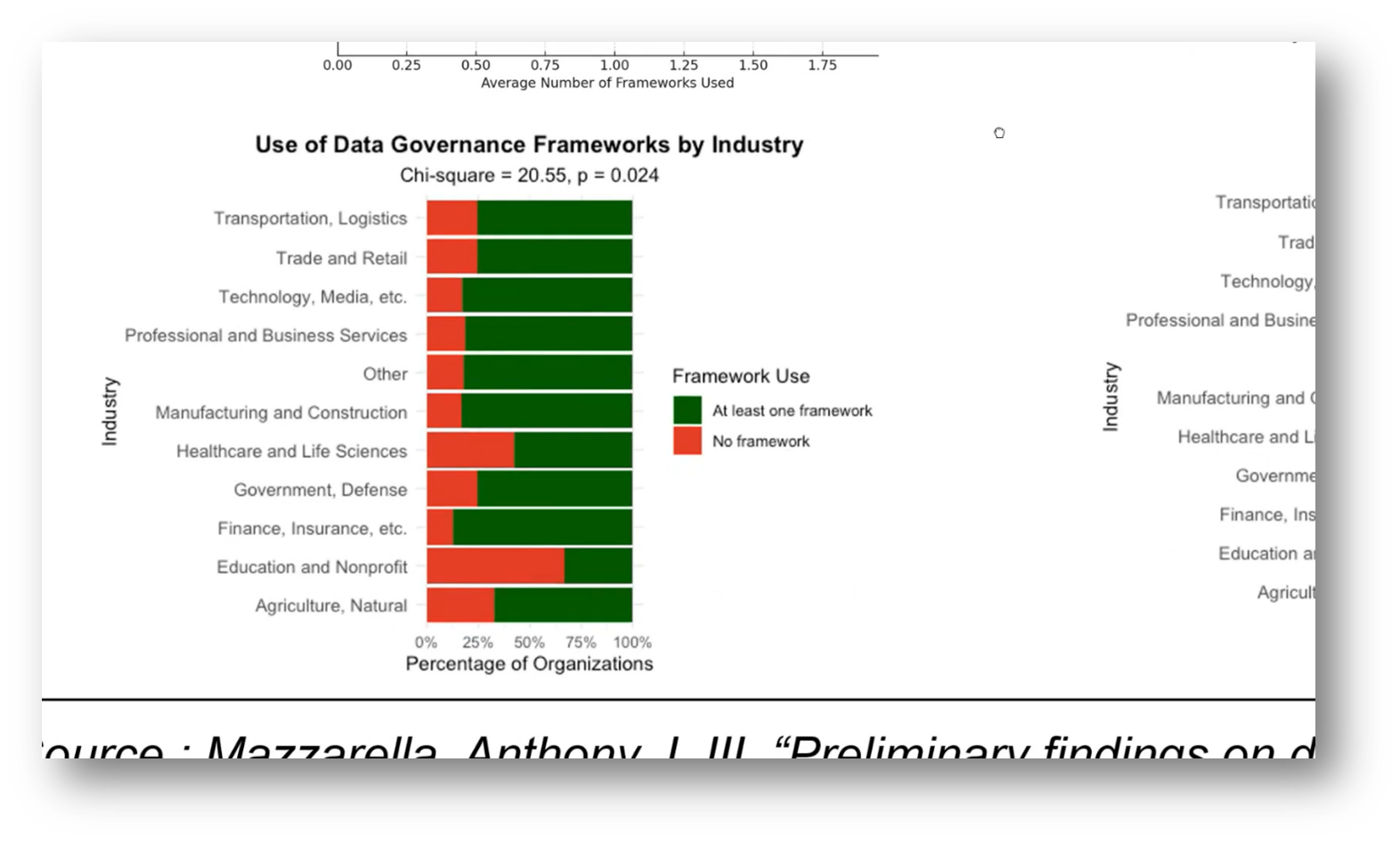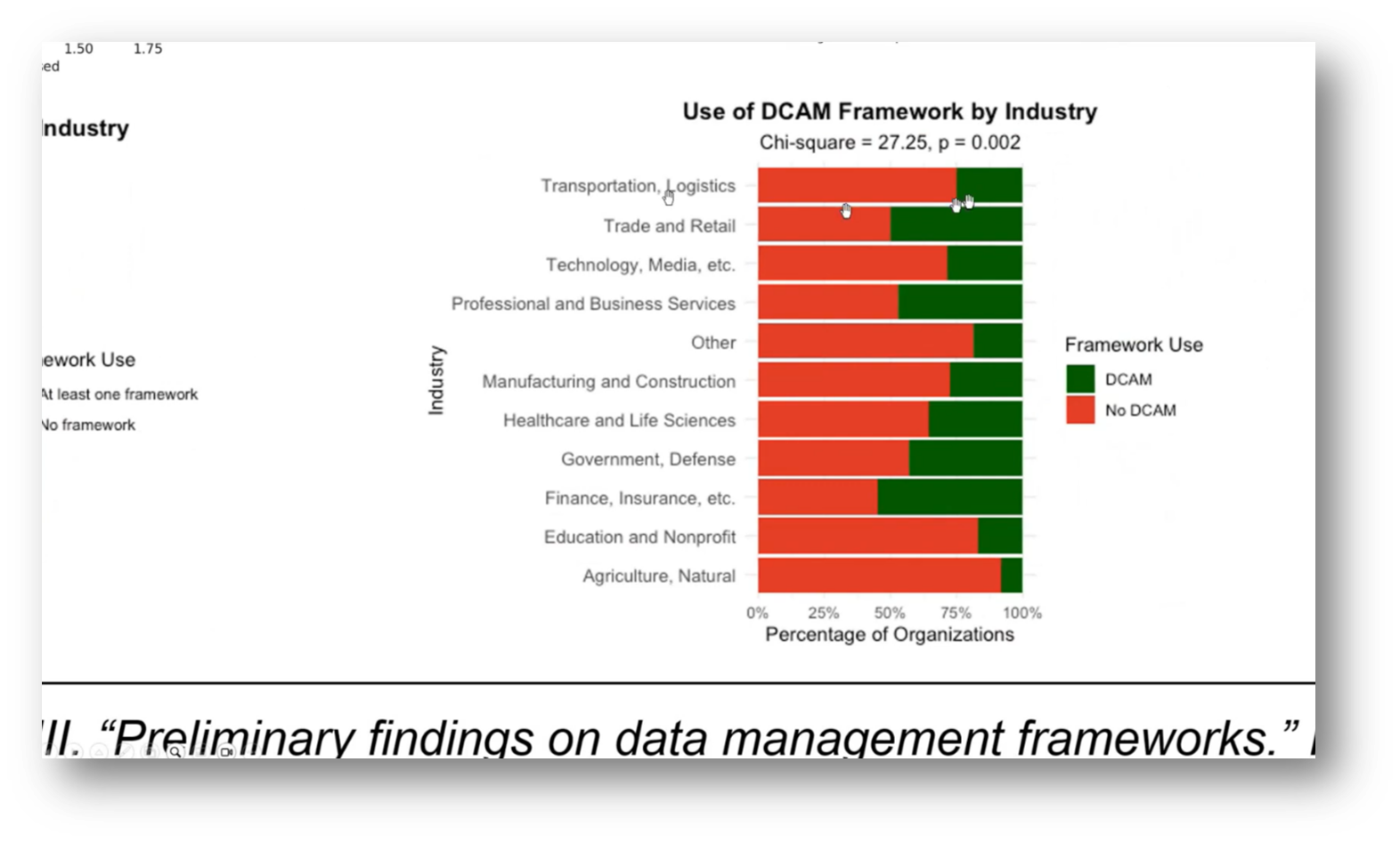 In a recent online discussion regarding data governance frameworks, various frameworks such as ISO 8000 and DGID were compared, highlighting the significant presence of non-numerical frameworks (NoNs). Howard notes that the analysis revealed that frameworks like DMBoK show a noteworthy prominence in sectors like trade and retail, though the specific categorisations remain unclear.