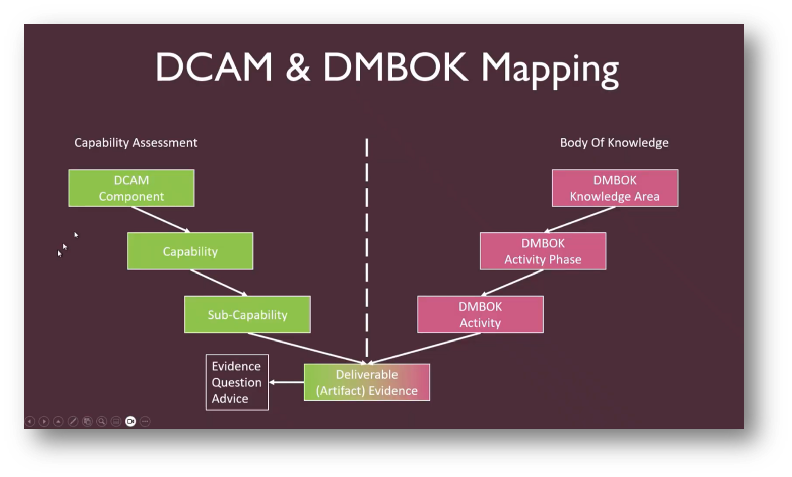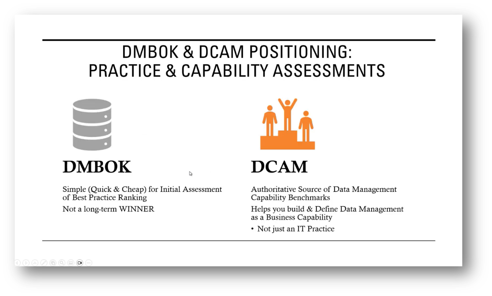 A discussion starts on the advantages of using DCAM over DMBoK for establishing data management benchmarks. Howard emphasises that DCAM's authoritative guidance on required capability levels is noted, as it offers standardised questions and advice to assess and improve data management practices. Additionally, DCAM provides clearer direction for maturity assessments.