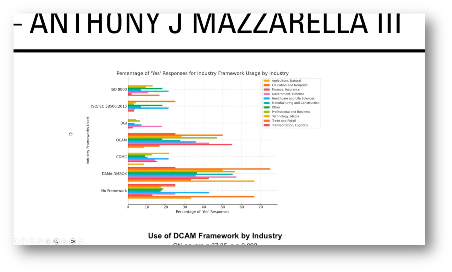 Howard highlights key statistics regarding the usage of DCAM and DMBoK frameworks among enterprises, with 19.25% utilising both, 31% not using either, 22% using only DCAM, and 27% using only DM Bach. He then emphasises the significance of addressing the substantial percentage of users who are not engaged with either framework, seeing it as an opportunity for growth within the community. Additionally, Howard acknowledges the challenges ahead in promoting these frameworks to data management enterprises but expressed optimism about the potential for positive change and improvement in the market.