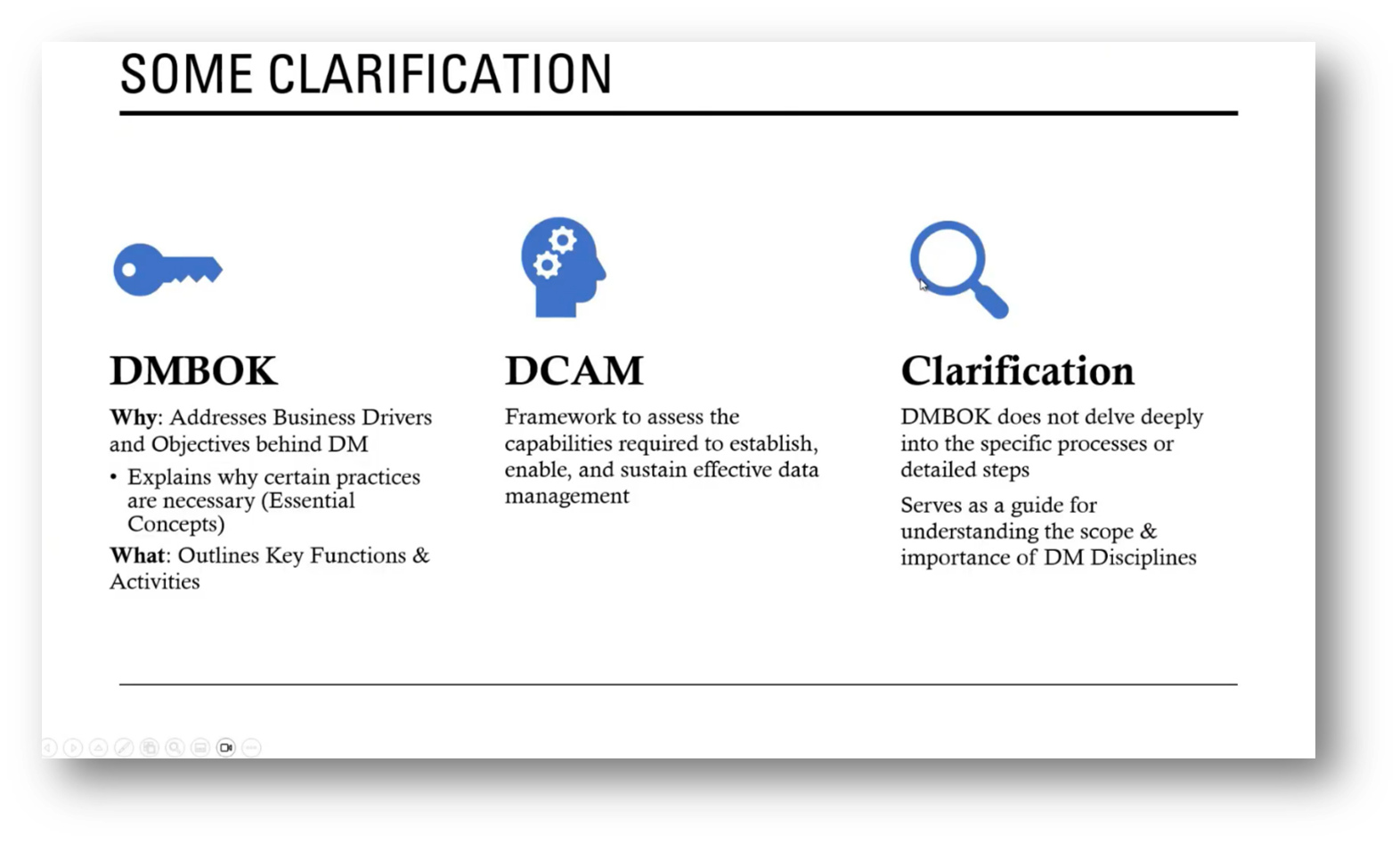 Many large corporations express confusion about how DCAM fits into their existing DMBOK frameworks, often questioning the need for DCAM at an enterprise level when they already utilise DMBOK. The aim is to clarify these concepts and foster a better understanding of their complementary roles in effective data management.