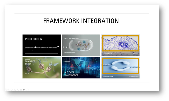 Howard Diesel opens the webinar and shares that his presentation focuses on integrating two frameworks, the Data Management Body of Knowledge (DMBoK) Version 2 Revised Edition and the Data Capability Assessment Model (DCAM), for enhanced data management in AI projects. He begins by addressing common misconceptions and clarifying the roles and purposes of these two frameworks.