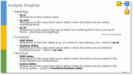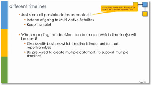 This webinar outlines the critical aspects of data vault, including the importance of time, data storage, multiple timelines, information reporting, and entity evolution processes. Remco Broekmans emphasises the significance of recording dates, handling multiple timelines in reporting, and effectively managing data processing and dimensional modelling in business. Additionally, the webinar covers best practices for customer phone numbers, record management, exceptional handling, context in dimensional models, and the use of batch ID. Remco also delves into the relevance of context and frequency in business analysis, along with notes on data storage and loading processes, ELM standards, logic models, and tool usage in data processing.