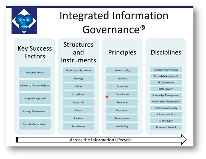 This approach aims to eliminate artificial distinctions and emphasises that organisations are fundamentally concerned with similar concepts. Additionally, it's essential to recognise the established disciplines within information governance, including IT governance, master data management, information risk, and information security, which are crucial for effective corporate governance.