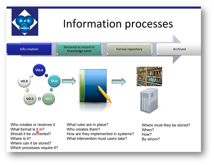 The process of information management involves several critical steps: understanding the origins and creation of information, including who creates it, when, how, and what system is utilised, as well as the necessary metadata to capture. Once this information is generated, it must be officially declared a record and placed into a formal repository for either archiving or destruction.
