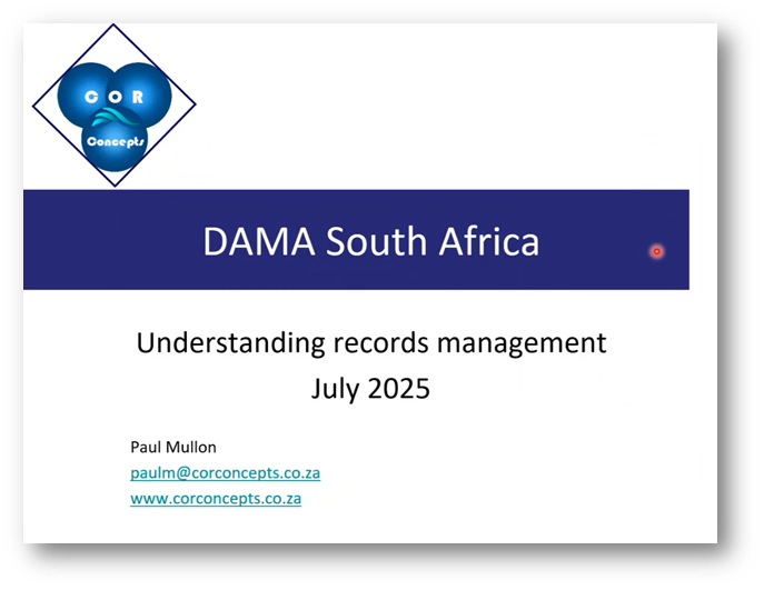 Paul then highlighted definitions from the National Archives and Record Services Act of South Africa, which governs records management in the public sector, alongside ISO definitions relevant to the private sector, showcasing both the similarities and the distinct approaches of each. Attendees were encouraged to familiarise themselves with the terminology and frameworks to navigate the interconnectedness of these fields better.