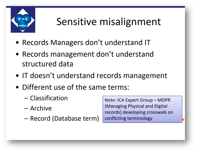 The distinction between how database specialists and records managers view data and records is significant, leading to challenges in establishing a unified standard for managing data as a record. While both involve recorded information, their interpretations diverge, reflecting a broader disconnect between IT governance and records management.