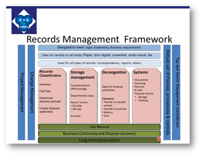 The framework for effective records management emphasises several key Success Factors essential for success: management commitment, well-defined policies, procedures, and controls, and robust change management to oversee programs and projects. It must align with legal, evidential, regulatory, and business requirements, reflecting the organisation's mandates and strategic objectives while encompassing all types of information across various media.