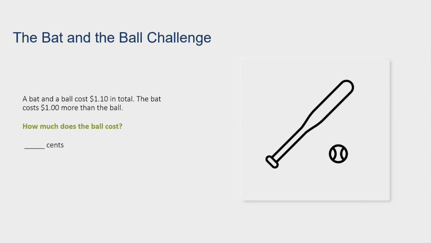 Can you solve this problem? The Bat and the Ball cost $1.10, and the Bat cost $1 more than the Ball. What is the cost of the Ball in cents? Many people say 10 cents, but this is not correct. This problem shows how our brain handles decision-making and how we often rely on quick instincts. The mistakes made in this problem demonstrate the two systems in our brain: intuition and careful reasoning. Interestingly, even Harvard students were tricked by this problem and answered “10 cents.”