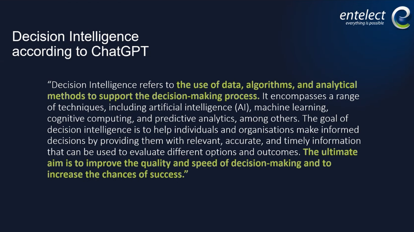 According to ChatGPT, decision intelligence aims to improve the quality and speed of decision-making processes to increase the likelihood of success.