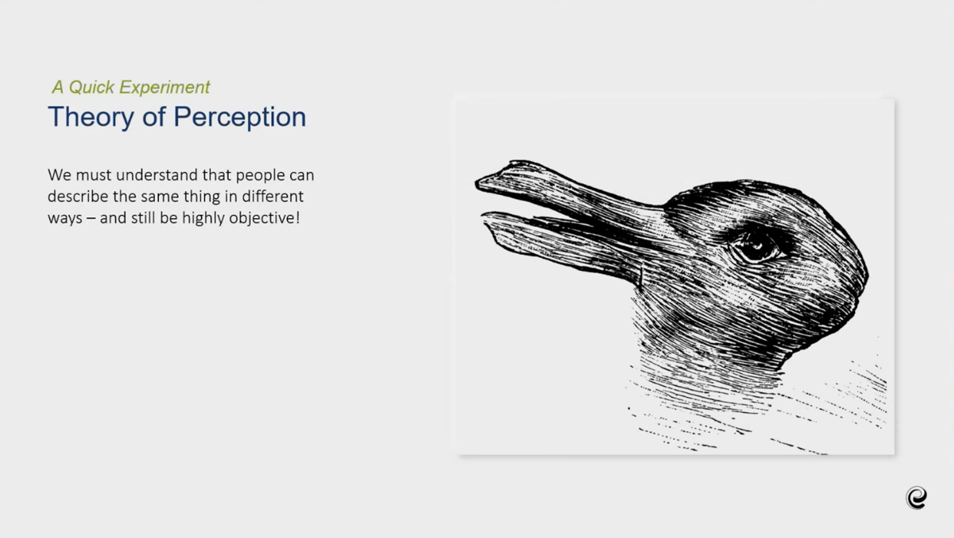 Erwin Bisschops is an experienced professional in the data field, having worked for 25 years in master data management, data analytics, and data science projects. During his career, he collaborated with Keith Jones at Harvey Jones in South Africa, where he was first introduced to JG. Additionally, Erwin spent over a decade at Elton Carabiner, where he oversaw the data and analytics Consulting Services arm. He manages a team of 85 data professionals at Intellect, ensuring their successful delivery in various data-related disciplines. During a presentation, Erwin introduced the theory of perception, highlighting that individuals can perceive the same thing objectively but describe it differently. He illustrated this concept by showing pictures, starting with an image that can be seen as a duck or a rabbit, depending on the angle. Erwin then presented a picture that can be interpreted as either an old lady or a young lady leaning on one's perspective.