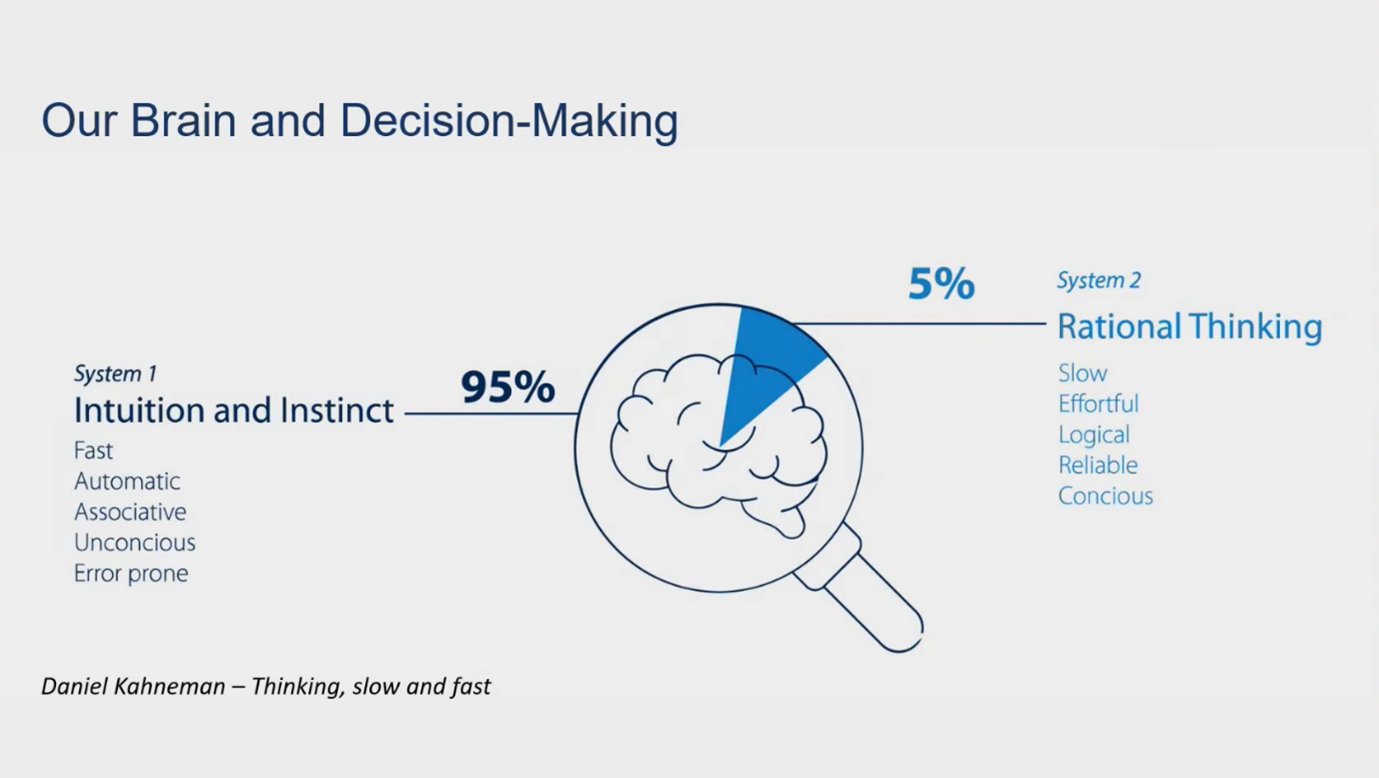 According to Daniel Kahneman, the human brain has two decision-making systems. System one operates unconsciously and automatically, accounting for 95% of our thinking. System two, however, is slow and rational, accounting for only 5% of our thinking. However, system two often relies on system one's suggestions to conserve energy, making it lazy.